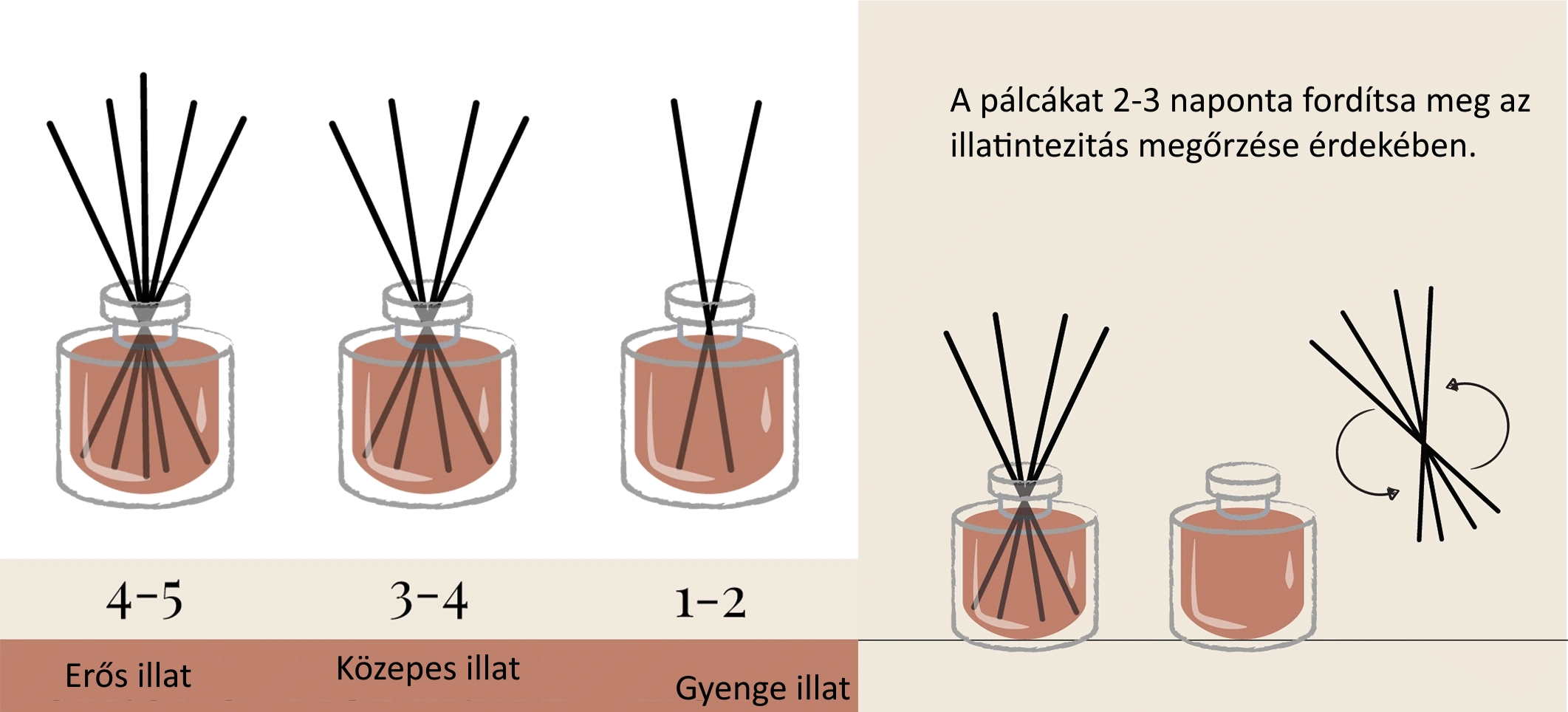 3. Az illat intenzitásának növelése érdekében ajánlott a mellékelt nádpálcák egészét vagy egy részét legalább naponta egyszer megforgatni.